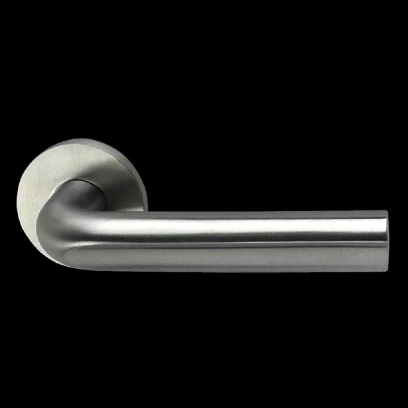 Garniture de poignées de porte ECLIPSE fabriquée en acier inoxydable brossé mat en forme ronde avec fraisage ergonomique pour le pouce*.